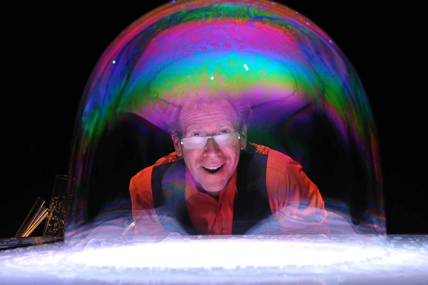 The tools of his trade are distilled water – it’s consistent no matter where he goes – and Dawn dishwashing detergent with a dose of glycerin. Those are the controlled ingredients. Humidity, temperature, a draft of wind, or even a bit of electricity in the air, can conspire against his bubble bonanza.